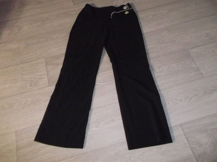 Pantalon de marque JUS D'ORANGE, taille 36 (voir mesures plus d'étiquette), léger de couleur noir, se fermant devant par fermeture zip et 2 boutons blancs sur le coté, avec un liseré blanc autour de la taille, effet très chic, légèrement évasé au bas. TBE Tour de taille à plat : 33 cms Longueur : 96 cms