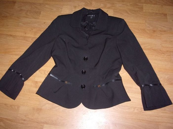 Veste de marque APART, taille 40, de couleur noire avec des liserés en simili cuir noir autour de la veste et au bas des manches 3/4 évasées, avec 2 petites décos dorées sigles. TBE Epaule à épaule : 39 cms Aisselle à aisselle : 47 cms Longueur : 54 cm