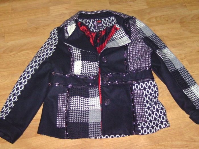 Veste de marque 101 IDEES, taille L soit 40, en laine et polyester entièrement doublée, très chaude, de couleur noire grise et blanche, se fermant devant par des boutons, pates aux épaules, de nombreuses breloques qui donnent un style à cette veste, 2 poches cotés. TBE Epaule à épaule : 40 cms Aisselle à aisselle : 53 cms Longueur : 64 cms