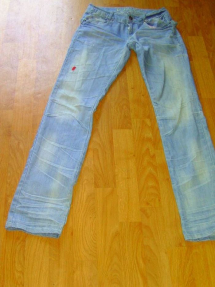 Jean de marque REDIAL, taille S soit 36, de couleur bleu ciel légèrement élastique, avec des endroits délavés plissés, des faux raccommodages, se fermant devant par fermeture zip et un bouton, 2 poches avant et 2 sur l'arrière dont 1 préformée pour petit portable ou autre, lien sur l'arrière pour donner un style. TBE Tour de taille à plat : 36 cms Longueur : 102 cms