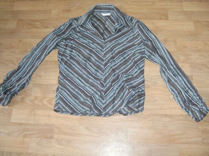 Chemisier de marque PROMOD, taille 38/40 (plus d'étiquette sinon se voit au travers), en voile de couleur bleu turquoise et marron, se fermant devant par des petits crochets, bas des manches resserré par élastique. TBE Epaule à épaule : 41 cms Aisselle à aisselle : 52 cms Longueur : 60 cms