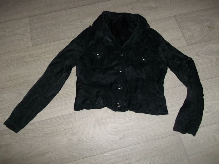 Blouson de marque SAN VINCENTE, taille 40, léger, effet froissé de couleur noir satiné, se fermant devant par de gros boutons pressions siglés, 2 poches poitrine à rabats pressionnés. TBE Epaule à épaule : 43 cms Aisselle à aisselle : 51 cms Longueur : 51 cms