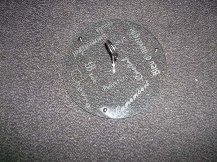 Plateau à fromages en verre avec poignée de transport amovible en inox ainsi que les petits pieds. TBE Diamètre : 30 cms