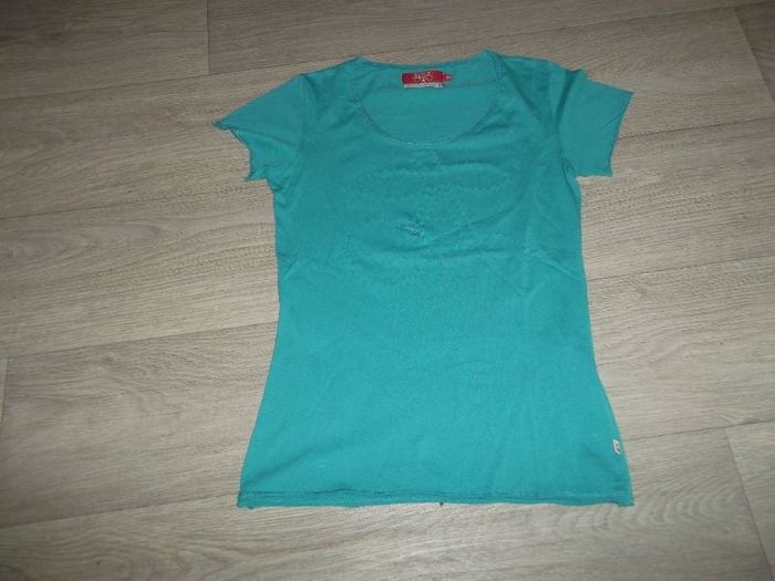 Tee shirt de marque LE TEMPS DES CERISES, taille M/38, de couleur bleu turquoise avec en déco devant le logo des cerises perforées. NEUF