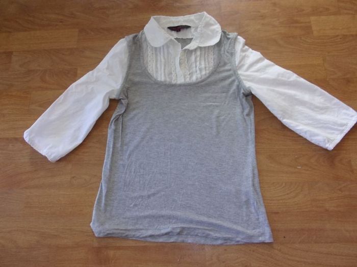 Chemise tee shirt de marque EST-ELLE COLLECTION, taille M, blanc pour le coté chemisier se fermant devant par des boutons avec des liserés de dentelle, manches 3/4 élastiquées sur le bas, et de couleur gris moucheté pour le tee shirt. TBE