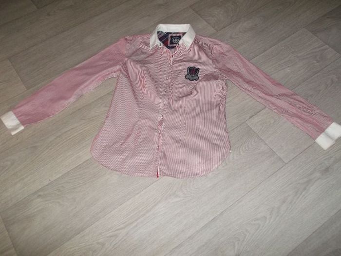 Chemise de marque BURTON, taille 38, de couleur rouge et blanche avec de fines lignes, col et bas des manches blancs, se fermant devant par des boutons translucides siglés, un écusson avec la marque sur la poitrine. TBE Epaule à épaule : 39 cms Aisselle à aisselle : 49 cms Longueur : 65 cms