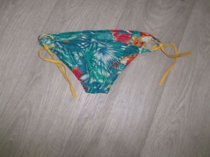 Monokini dégriffé taille 36 en coton multicolore avec des feuilles et fleurs partout, 2 liens en lycra extensibles sur les côtés réglables. TBE PAS DE PHOTO PORTE