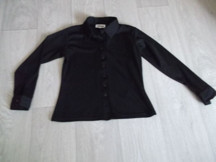 Chemisier de marque ORIGINAL CLOTHING, taille S, de couleur noir en polyester, se fermant devant par des boutons de couleur pourpre, ainsi que le bas des manches. TBE Epaule à épaule : 42 cms Aisselle à aisselle : 49 cms Longueur : 58 cms