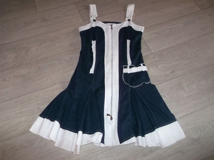Robe de marque ARMAND THIERY Affinités, taille 40, de couleur bleu marine et blanche, à bretelles, se fermant devant par une fermeture zip tout le long, permettant d'ouvrir en haut et en bas comme l'on désire, une petite poche coté, en lin et coton . TBE