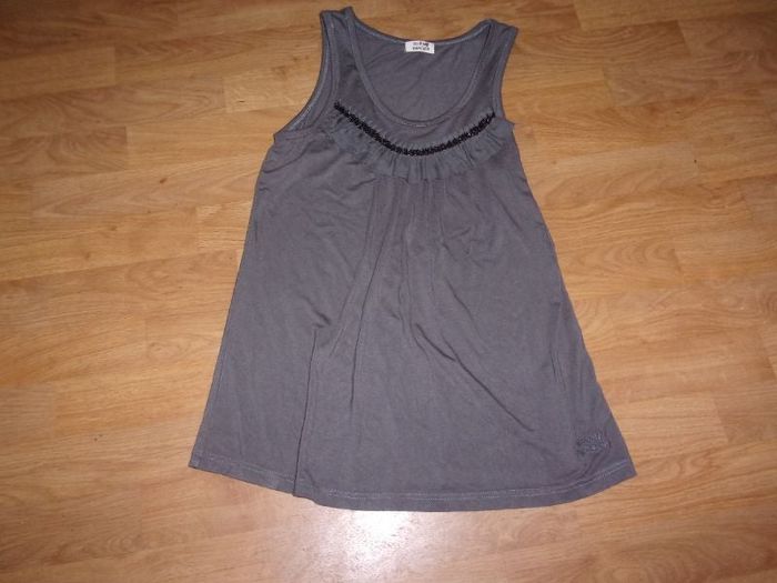 Tunique courte de marque MOLLY BRACKEN, taille M, de couleur grise, sans manches, fluide, avec devant en déco un empiècement en tulle gris et un liseré brillant noir, la marque est au bas devant. NEUVE
