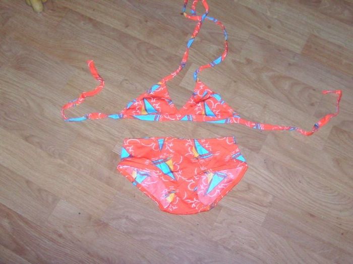 Maillot fillette marque DARINA, taille 6 ans, multicolore fond orange et des bateaux, soutien gorges se fermant par des noeuds au dos et cou . NEUF