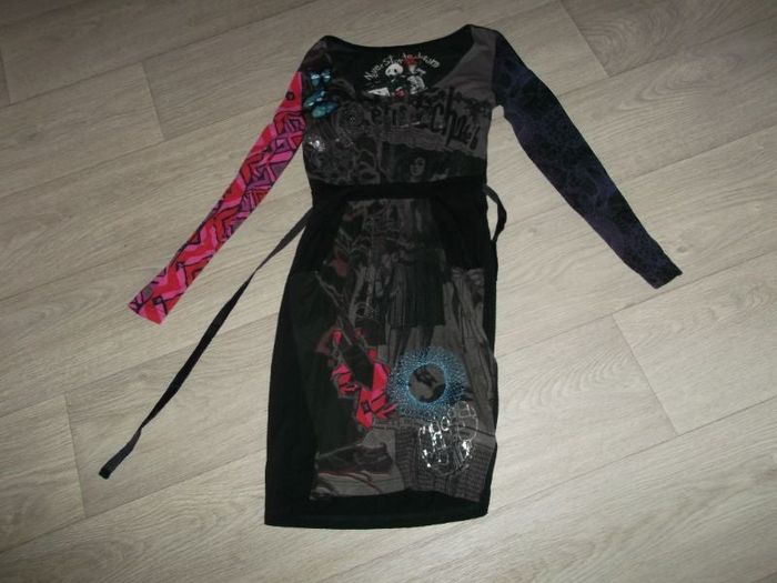 Robe de marque DESIGUAL, taille S, de couleur noir et multicolore avec des papillons, des écritures en sequins, 2 poches sur les côtés, ceinture non amovible , marque sur l'arrière en haut du dos. TBE