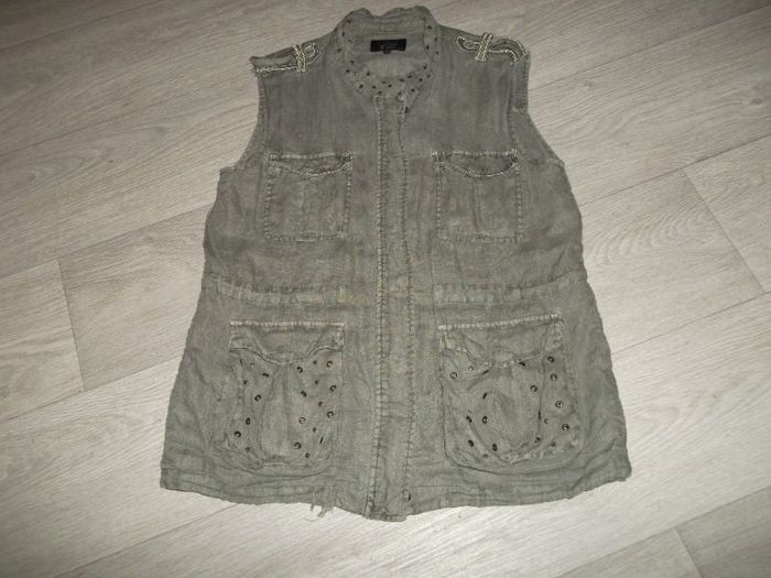 Veste de marque LE TEMPS DES CERISES, taille M, légère, en lin de couleur kaki, sans manches, se fermant devant par fermeture zip et des boutons pressions, pattes aux épaules, 2 poches poitrine à rabat et boutons pressions, 2 poches au bas pressionnées et avec des rivets partout en déco, lien à la taille et au bas pour resserrer . TBE