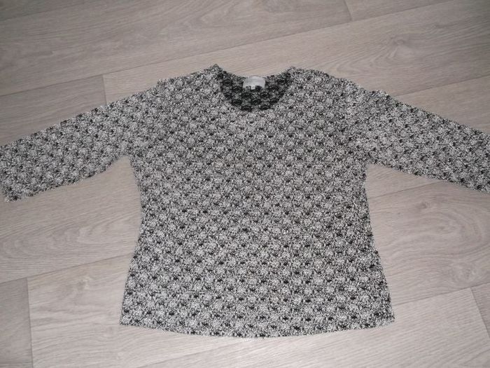 Tee shirt ou haut de marque JOFRATI, taille 4/42/XL, de couleur argenté et noir, style dentelé ajouré et doublé devant sur la poitrine, manches 3/4, idéal soirée. TBE Epaule à épaule : 43 cms Aisselle à aisselle : 52 cms Longueur : 52 cms
