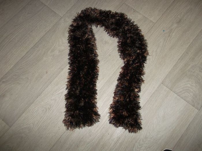 Echarpe très douillette, tons chauds, noire , ocre, rouille et marron. TBE Longueur : 140 cms Largeur : 15 cms