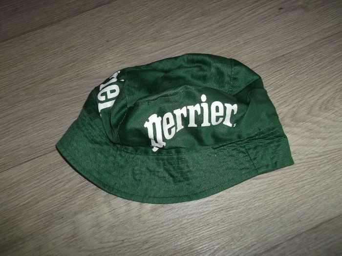 Bob, chapeau d'été de couleur vert avec la marque PERRIER inscrite tout autour en blanc, en coton, marqué taille L, 54 cms de tour. TBE