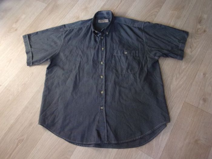 Chemisette de marque PHILADELPHIA COMPANY, taille environ XL (plus d'étiquette voir les mesures), de couleur gris anthracite avec les coutures blanches, se fermant devant par des boutons marrons dégradés, ainsi que le col, poche poitrine fermée par bouton. TBE Epaule à épaule : 53 cms Aisselle à aisselle : 65 cms Longueur : 80 cms