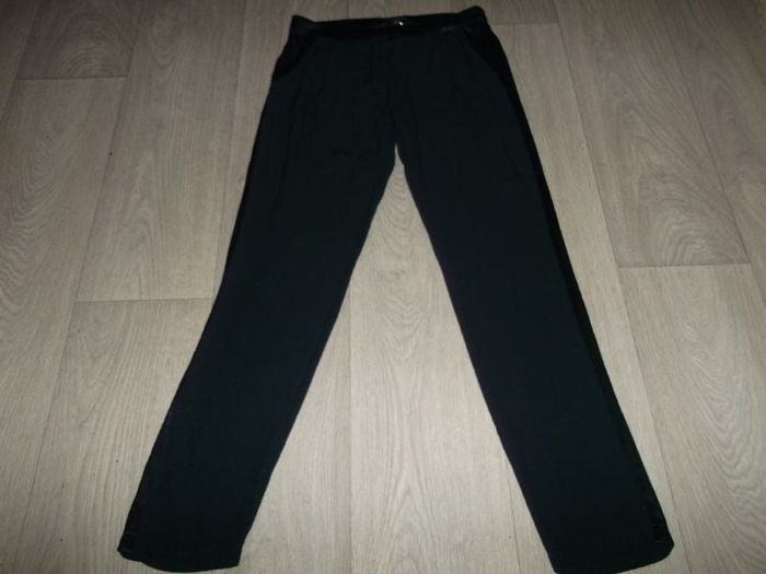 Pantalon de marque LA PETITE FRANCAISE PARIS, taille 38, pour soirée, fluide et léger style crêpe, à pinces, de couleur bleu marine, se fermant devant par fermeture zip et un crochet invisible sur l'extérieur, 2 poches coté avec empiècements bleu marine en satin, ainsi que sur la taille et le long des jambes, sur l'arrière une fausse poche également avec un liseré satin. TBE Tour de taille à plat : 38 cms Longueur : 104 cms