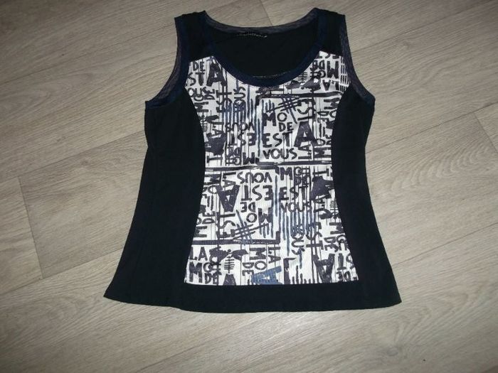 Top fluide de marque LA MODE EST A VOUS, taille 3/40/L de couleur bleu marine avec un encart blanc devant avec la marque inscrite partout, un petit noeud brillant en déco sur le haut. TBE