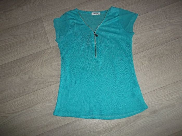 Pull léger de marque FEMINITY, taille unique soit 36/38, de couleur bleu turquoise avec un zip pour fermeture, manches courtes en voile ainsi qu'une partie du dos en haut avec des strass en déco. TBE Epaule à épaule : 34 cms Aisselle à aisselle : 44 cms Longueur : 60 cms