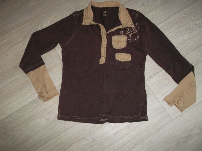 Tee shirt, taille L, de couleur marron foncé avec un col chemise marron clair ainsi que le bas des manches, les mini poches. Le marron clair est frangé. TBE