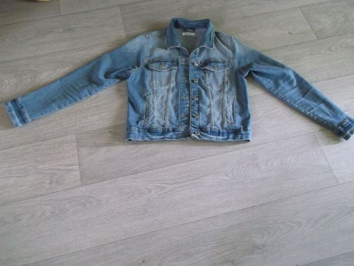 Veste en jean de marque CACHE CACHE, taille 38 (voir mesures plus d'étiquettes), de couleur bleu moyen et délavé, se fermant devant par des boutons siglés, 2 poches poitrine à rabats fermées et 2 poches côtés, légèrement élastiquée. TBE Epaule à épaule : 38 cms Aisselle à aisselle : 48 cms Longueur : 52 cms