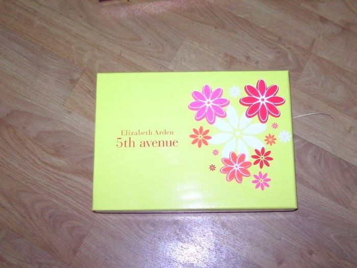 Coffret de parfum cartonné ELISABETH ARDEN 5TH AVENUE vide pour collectionneur, fleurs en relief. TBE Dimensions : 28 x 20 x 6 cms