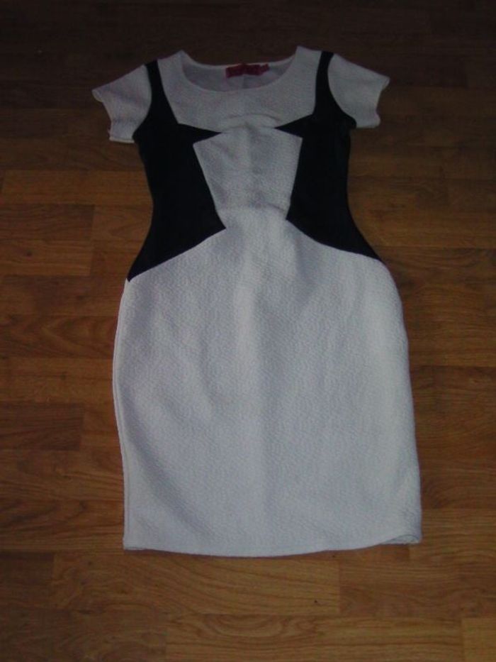 Robe de marque BOOHOO, taille 36 EUR, en matières extensibles bi colore blanc cassé et noir, la couleur claire est un peu gaufrée, manches courtes. TBE