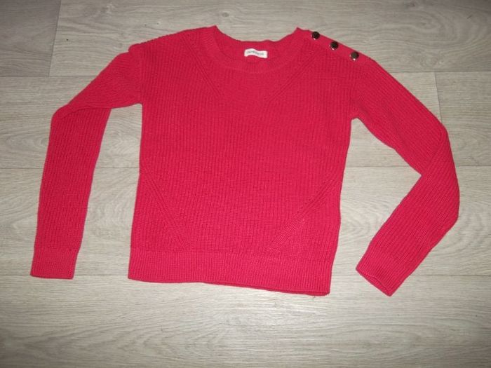 Pull de marque CACHE CACHE, taille XS, de couleur rose rouge framboise, avec 3 boutons en déco sur un coté d'une épaule et des mini ouvertures carrées sur le haut et le bas du pull. NEUF VISIBLE SUR AGEN OU ENVOI POSSIBLE EN PAIEMENT SECURISE