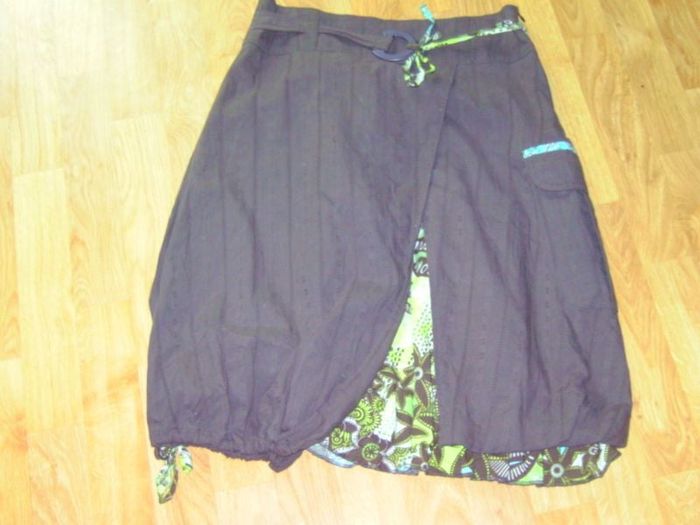 Jupe taille 38 de couleur marron avec des rajouts tissu multicolore vert blanc bleu turquoise, , fermée par zip quasi invisible sur un coté, bouffante vers le bas avec des liens pour serrer ou non, 1 poche à rabat, ceinture non amovible assortie. NEUVE Tour de taille à plat : 38 cms Longueur : 62 cms