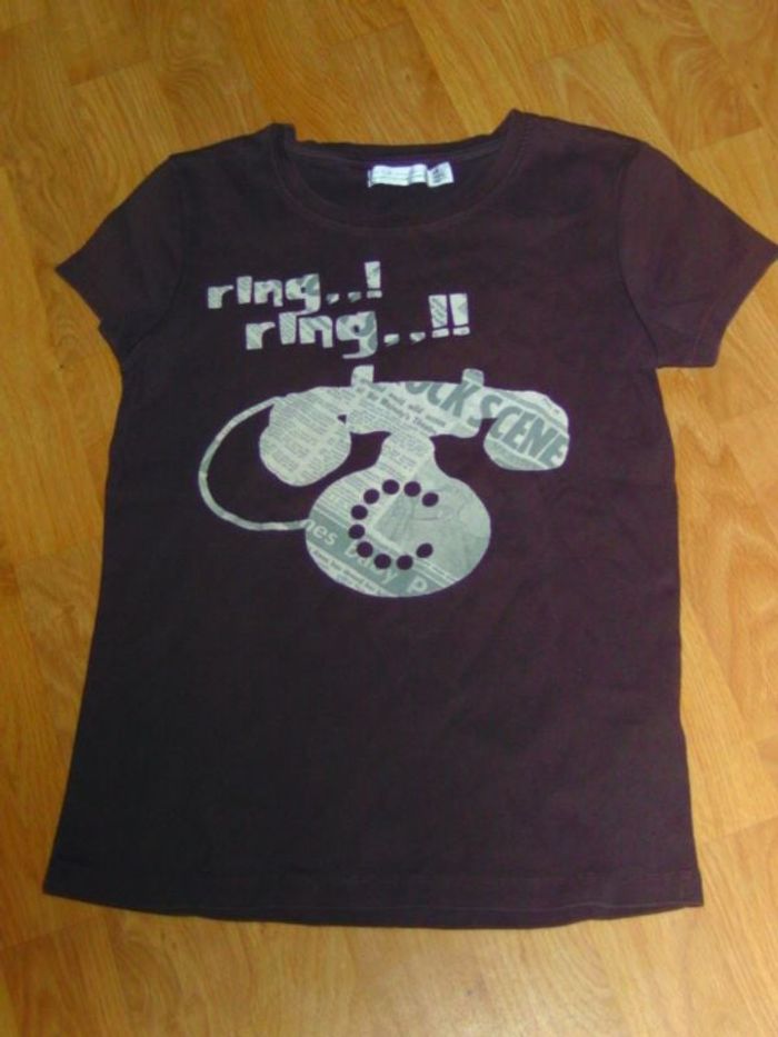 Tee shirt de marque ZARA, taille L soit 38/40, de couleur marron avec le sigle "RING RING" et un téléphone couleur journal. TBE