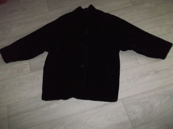 Veste de marque LORENZI PARIS, made in France, mi longue, en fausse fourrure de couleur noire, se fermant devant par des boutons, 2 poches côtés, taille 42. TBE Aisselle à aisselle : 62 cms Longueur : 74 cms