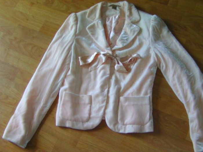 Veste de marque H&M, taille 38, en tissu style velours touché pêche et de couleur pêche, très agréable à porter, se fermant devant par des petits crochets et un noeud en satin de même couleur. 2 poches sur les cotés. TBE Epaule à épaule : 39 cms Aisselle à aisselle : 49 cms Longueur : 53 cms
