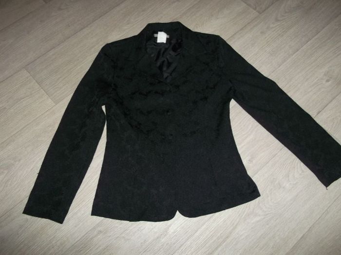 Veste de marque FIONELLA DI VERDI, taille 40, de couleur noire en tissu fluide style damassé, se fermant devant par des boutons. TBE Epaule à épaule : 41 cms Aisselle à aisselle : 47 cms Longueur : 61 cms
