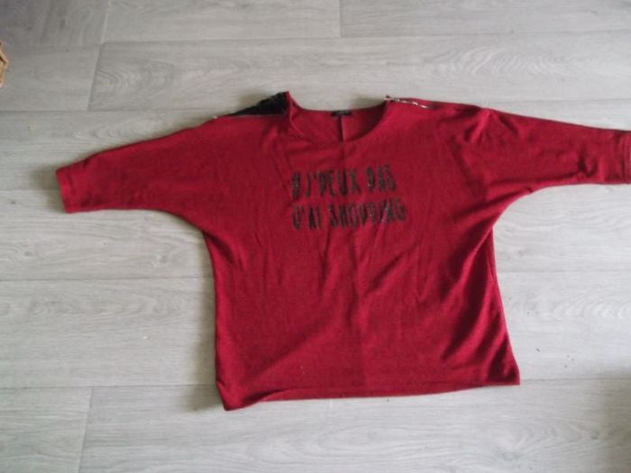 Pull de marque LIBERTO, léger, ample, de couleur bordeaux, taille L, avec la mention devant "#J'PEUX PAS J'AI SHOPPING" en lettres argentées brillantes, manches 3/4, aux épaules des fermetures zips pouvant s'ouvrir afin de faire apparaitre de la dentelle noire ou laisser fermées. TBE