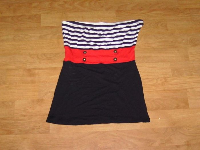 Bustier de marque MIM, taille S, tenant par élastique à la poitrine, de couleur noir, rouge et blanc, avec en déco, 4 boutons ronds. TBE