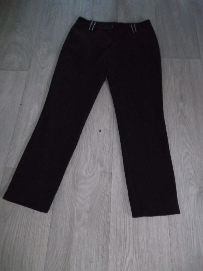 Pantalon, taille 38, (grand voir mesures), de couleur noir, se fermant devant par fermeture zip et un bouton, 2 poches côtés et des passants pour ceinture dont les 2 devant scintillants noir et argenté. TBE Tour de taille à plat : 41 cms Longueur : 97 cms