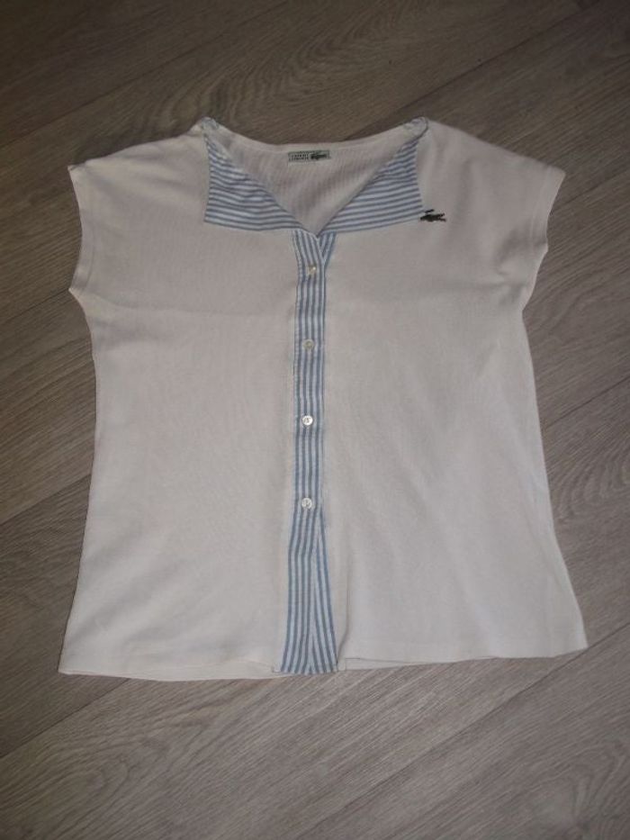 Polo tee shirt de marque LACOSTE, taille 40, de couleur blanc avec un empiècement tissu bleu et blanc rayé sous les boutons ainsi que sur le col rabattable. TBE pour un vintage.