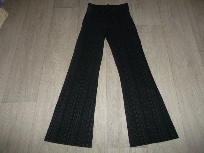 Pantalon dégriffé, taille 36 (voir mesures), de couleur noir avec de fines lignes roses et violettes, se fermant devant par fermeture zip et deux boutons, deux passants pour ceinture devant, légèrement élastiqué, évasé. TBE Tour de taille à plat : 34 cms Longueur : 103 cms Largeur bas à plat : 25 cms