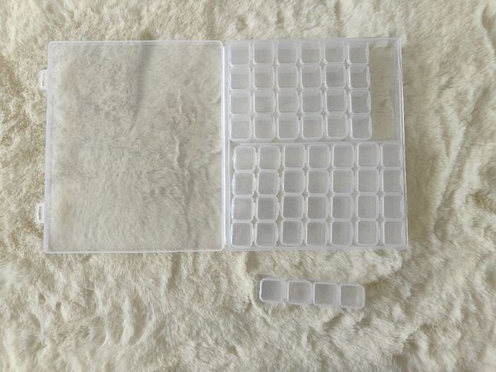 Boite de rangement composée de 56 Grilles, Taille de la boîte environ 21x17cm et chaque boîte mesure environ 2cm X 2.5 cm En plastique transparent Idéal pour ranger du loisirs créatifs comme par exemple diamond painting Très bon état