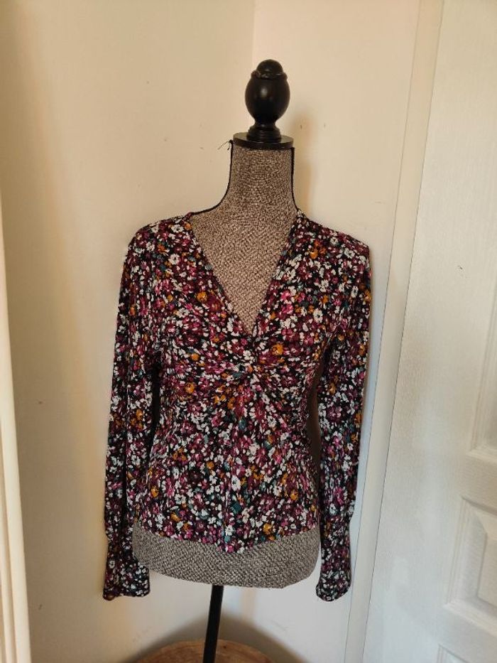 Blouse manches longues motifs fleurs multicolores Matière douce et agréable Décolleté noué De la marque cache cache Taille L Très bon état