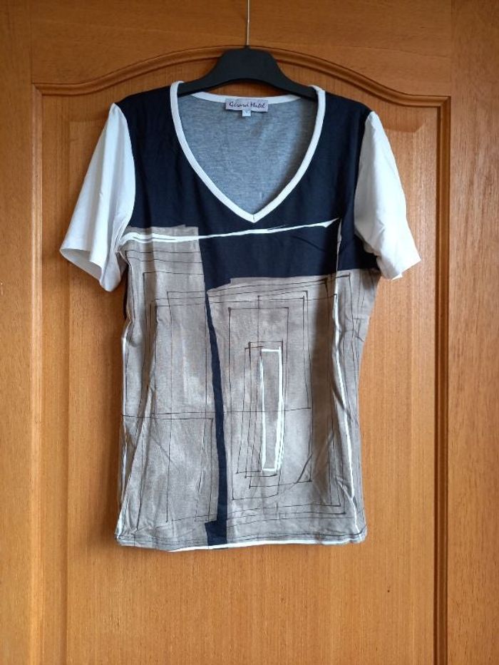 Joli Tee-shirt noir motif beige clair et beige foncé Dos uni noir Col V Taille 1 Toutes petites bouloches sous les bras 📦 envoi rapide 💳 n'hésitez pas à faire un lot le mode réduction est activé D'autres articles similaires dans mon dressing pourraient vous intéresser : #nath62278femme38 #nath62278femme40