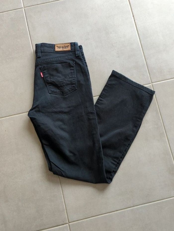 Jean Levi's droit noir taille 30x34, largeur taille 38cm, longueur entrejambe jusqu'en bas 74cm. Légère usure à l'entrejambe, voir dernière photo. Excepté ça, très bon état