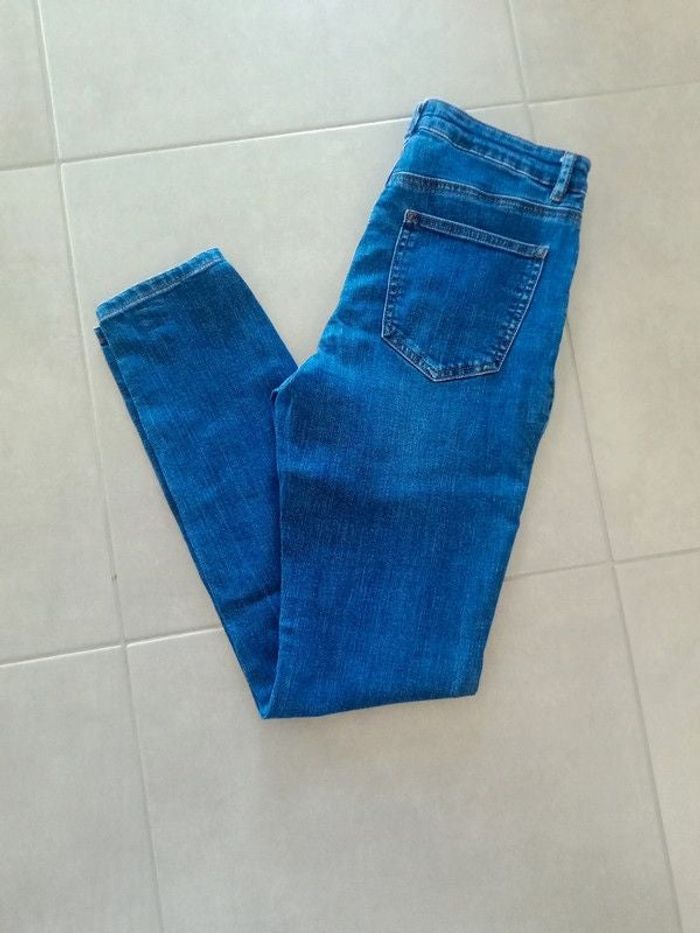 Jean Camaïeu taille 38, largeur au niveau de la taille 35cm, longueur entrejambe jusqu'en bas 73cm. Contient 2% d'elasthanne