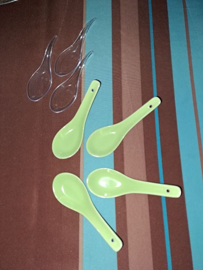 Lot de 4 cuillères apéritives très bon état servies une fois, vertes, en ceramique et hé donne 3 cuillères plastiques #marisa44190maison