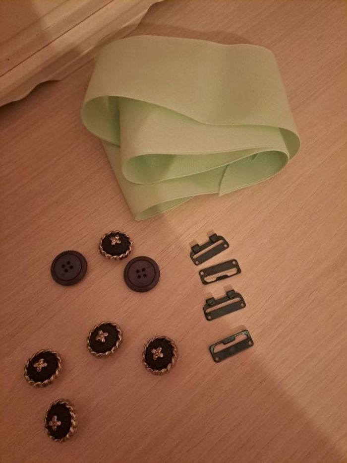 Lot mercerie 5 boutons noir doré 2 boutons marine 2 crochets jupe 1 ruban vert