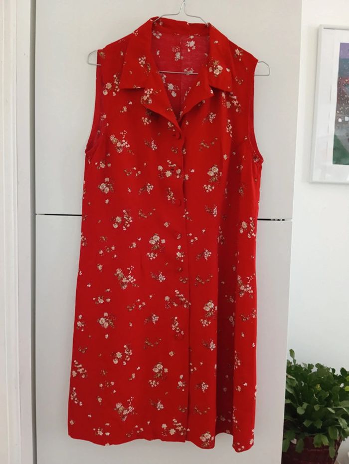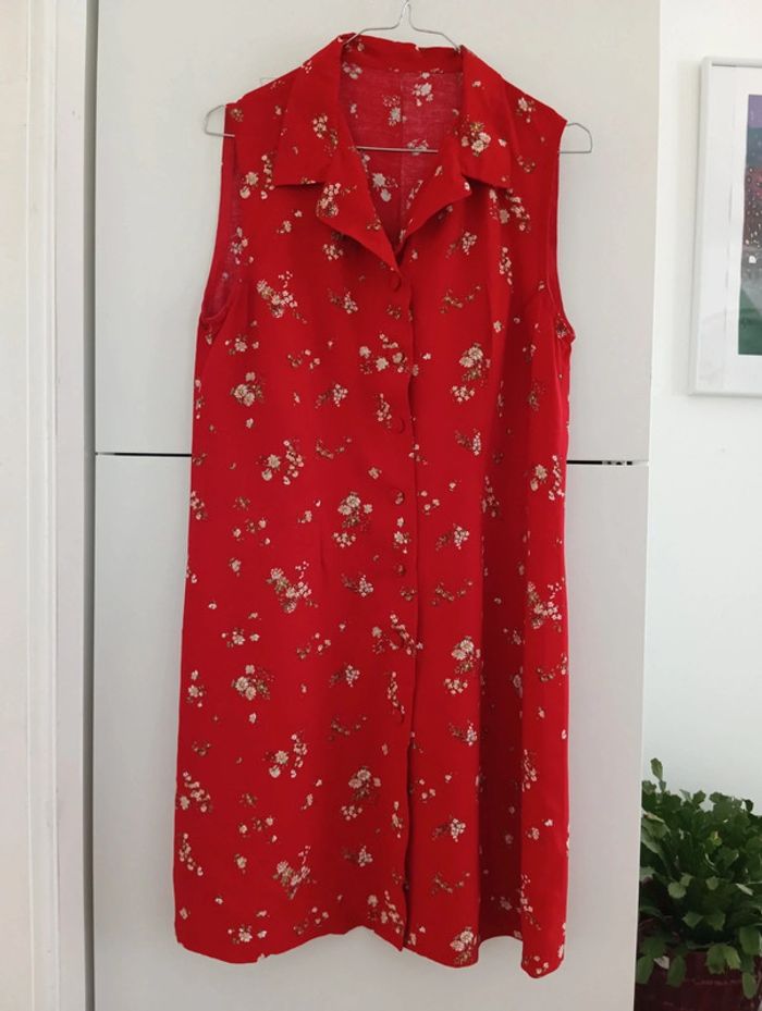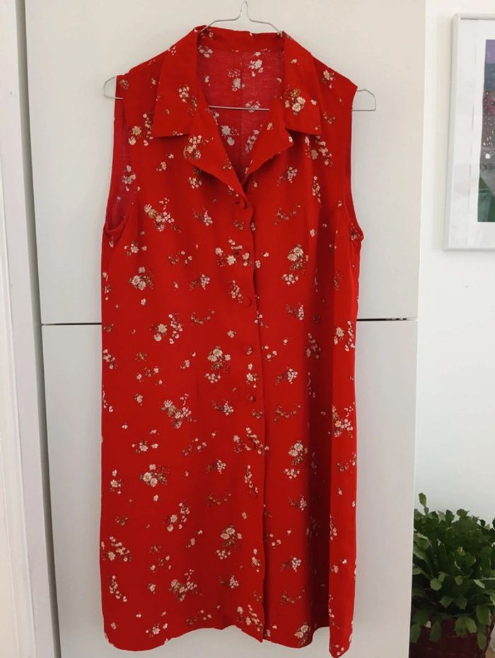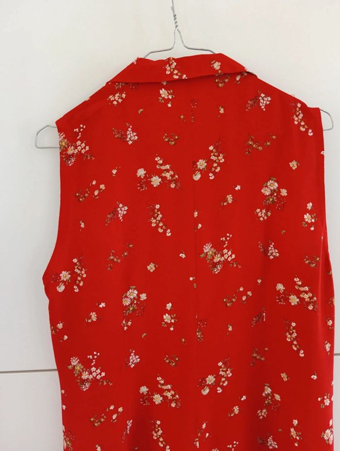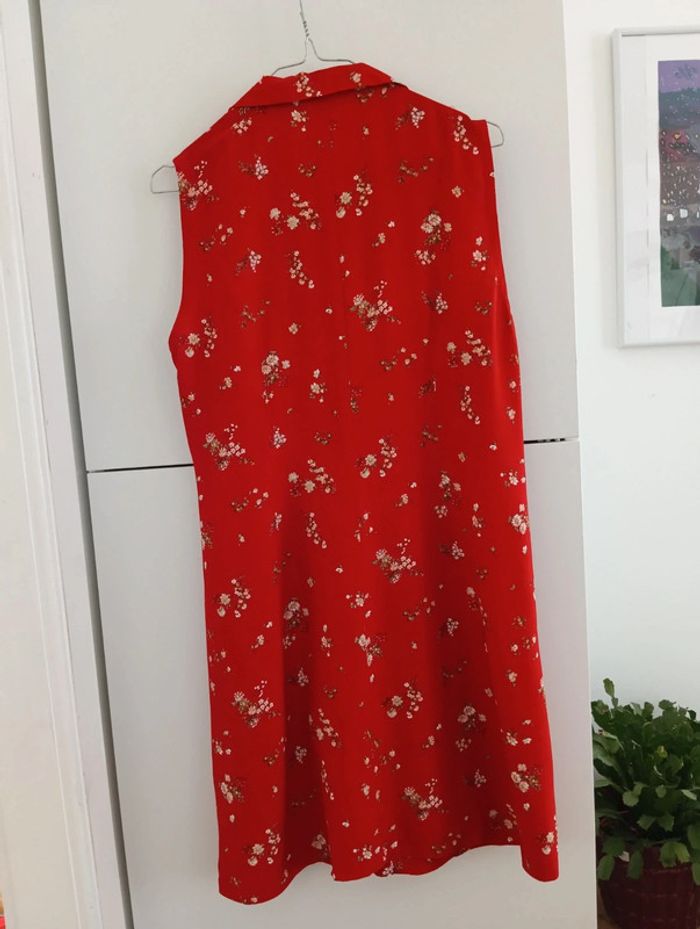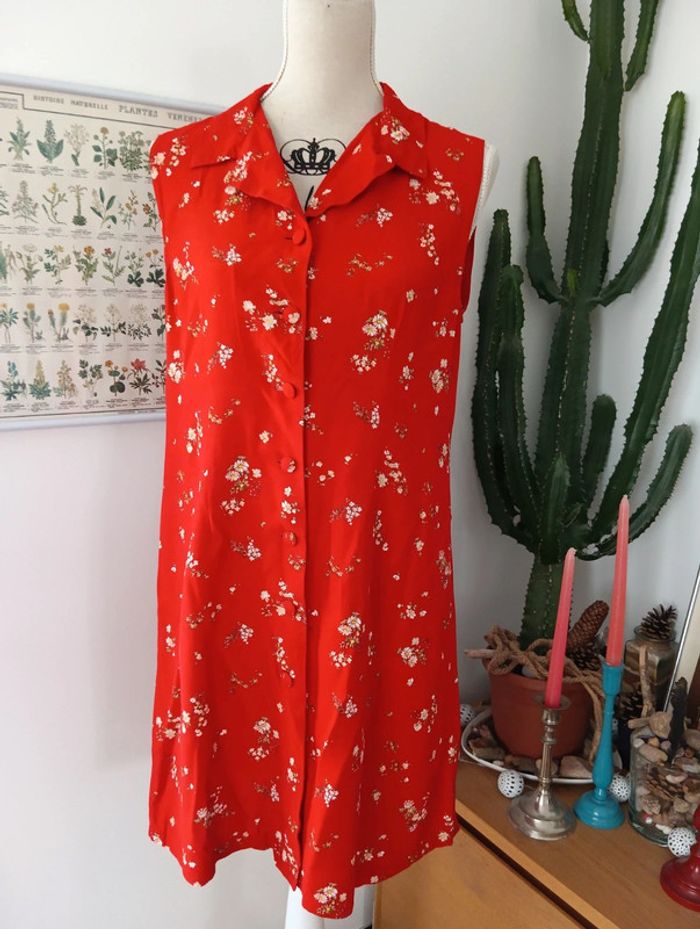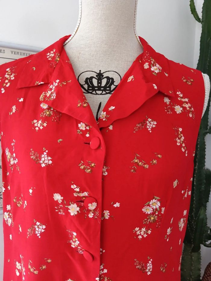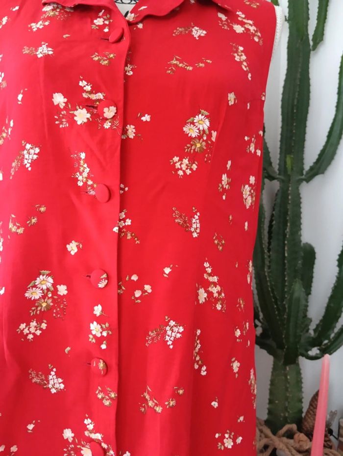 Robe vintage boutonnée rouge à fleurs Réalisée par un couturier, Sans manches , En viscose Mesures Epaules 40cm Aisselles 48cm Longueur 91cm