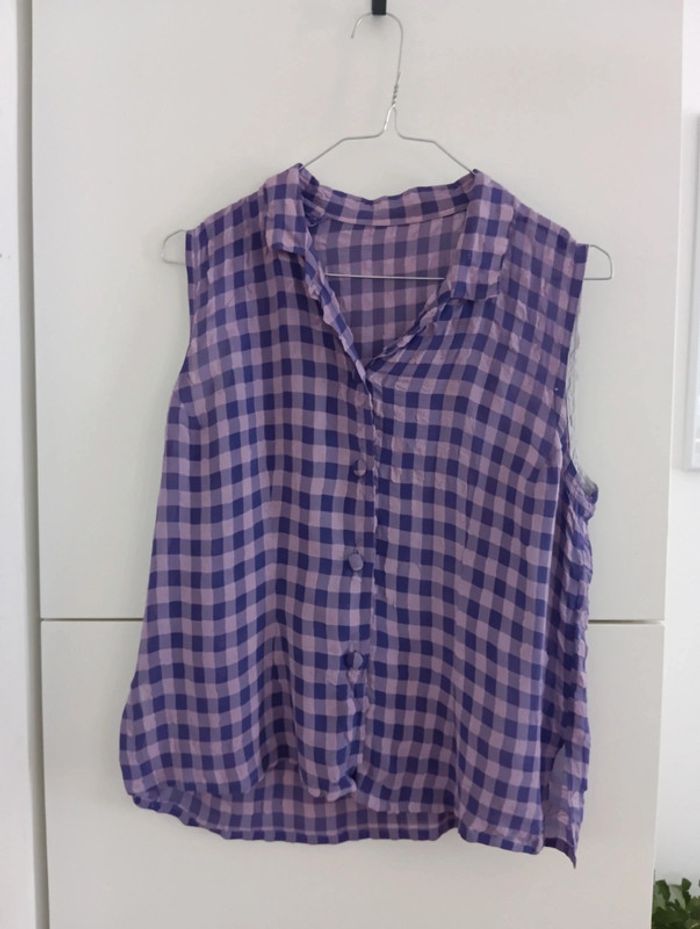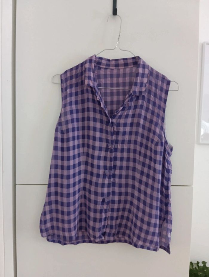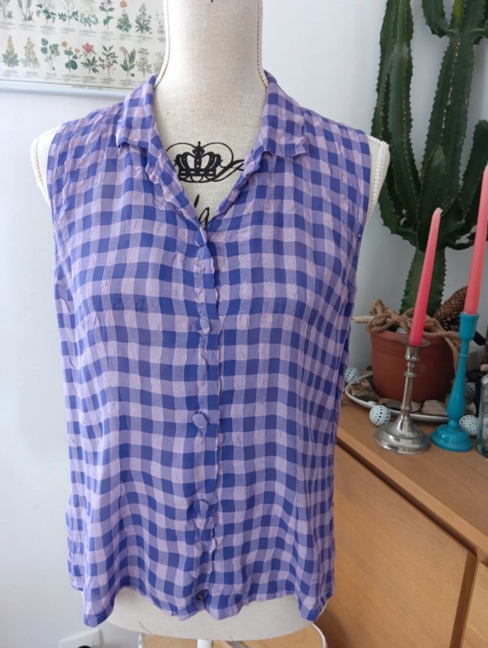Blouse vintage handmade à carreaux violets Taille 40 estimée Voile Mesures Epaules 34cm Aisselles 50cm Longueur 58cm Aucune indication de matière Peut être de la viscose sans certitude.