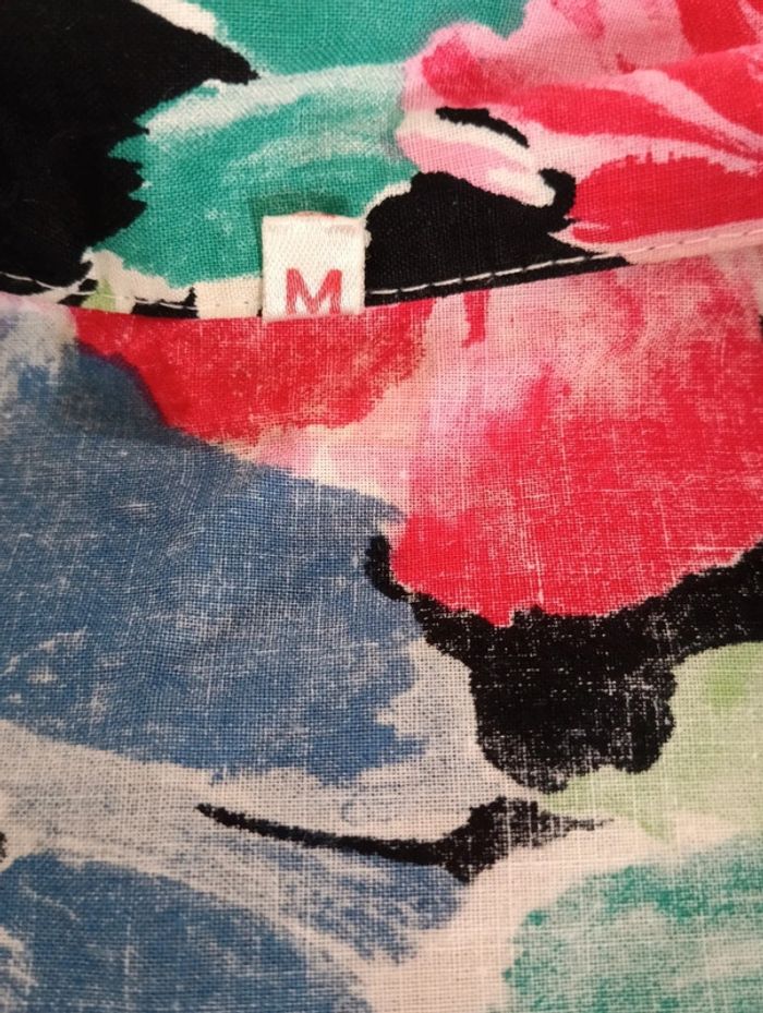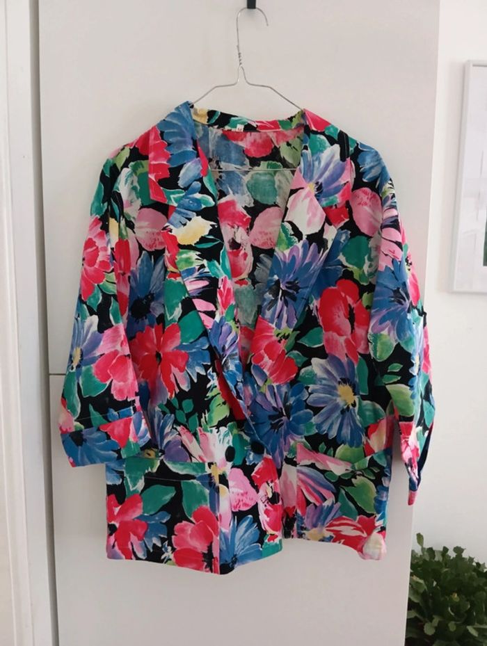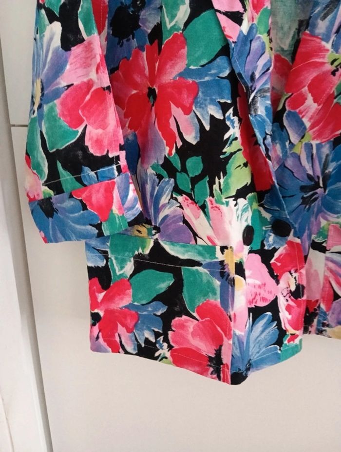 Veste blazer en coton fleurs multicolores Non doublée Taille M indiquée peut convenir à plusieurs tailles, jusque 40/42 selon l'effet souhaité,à vérifier avec les Les mesures Epaules 43cm Aisselles 57cm Longueur 67cm Boutonnage croisé, deux poches plaquées à l'avant.