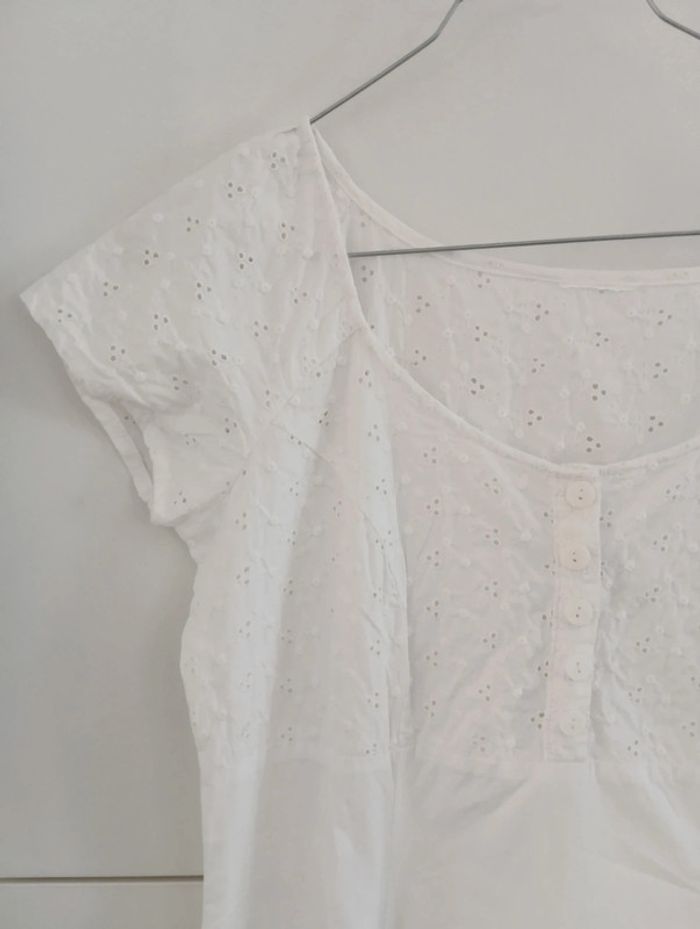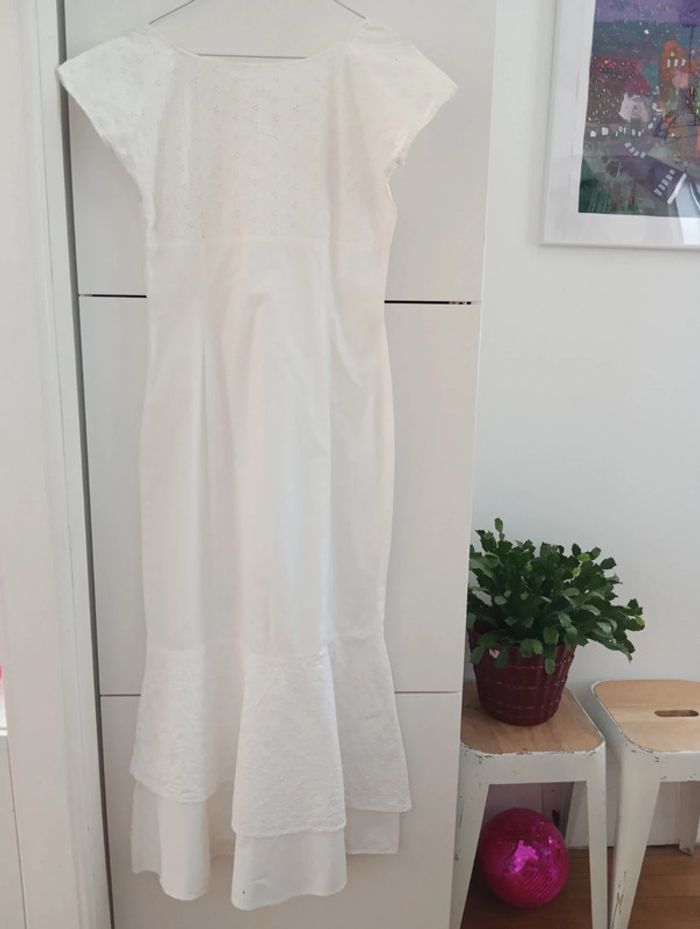 Robe longue blanche en coton Haut boutonné jusque sous la poitrine broderie anglaise, Bas volanté broderie anglaise. Fermeture sur le côté. Taille 38 estimée à confirmer avec les Mesures Epaules jusqu'au bout des manches 56cm Aisselles 43cm Taille 37,5 longueur 132cm